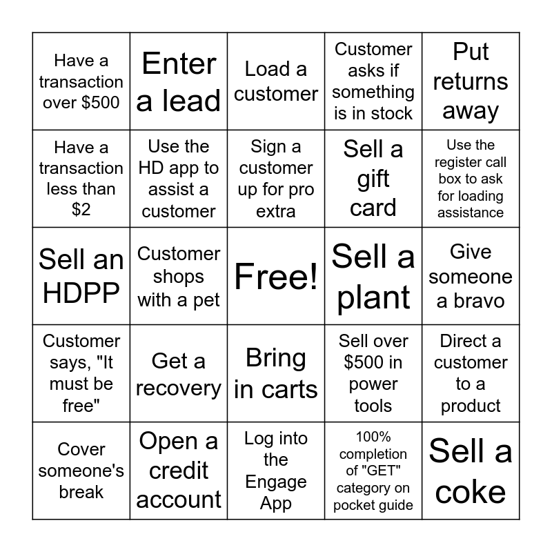 This bingo card has a free space and 24 words: Get a recovery, Open a credit account, Sign a customer up for pro extra, Cover someone's break, Put returns away, Have a transaction over $500, Have a transaction less than $2, Enter a lead, Sell a plant, Bring in carts, Sell a gift card, Sell an HDPP, Sell over $500 in power tools, Direct a customer to a product, Use the HD app to assist a customer, 100% completion of "GET" category on pocket guide, Give someone a bravo, Load a customer, Use the register call box to ask for loading assistance, Customer shops with a pet, Sell a coke, Customer says, "It must be free", Customer asks if something is in stock and Log into the Engage App.