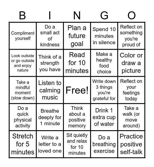 This bingo card has a free space and 24 words: Breathe deeply for 1 minute, Write a letter to a loved one, Read for 10 minutes, Stretch for 5 minutes, Reflect on something you're proud of, Compliment yourself, Look outside or go outside and enjoy nature, Do a small act of kindness, Write down 3 things you're grateful for, Think about a positive memory, Make a healthy food choice, Take a mindful moment (slow down), Drink 1 extra cup of water, Take a walk (or move around), Think of a strength you have, Do a breathing exercise, Reflect on your feelings today, Plan a future goal, Color or draw a picture, Listen to calming music, Practice positive self-talk, Do a quick physical activity, Spend 10 minutes in silence and Sit quietly and relax for 10 minutes.