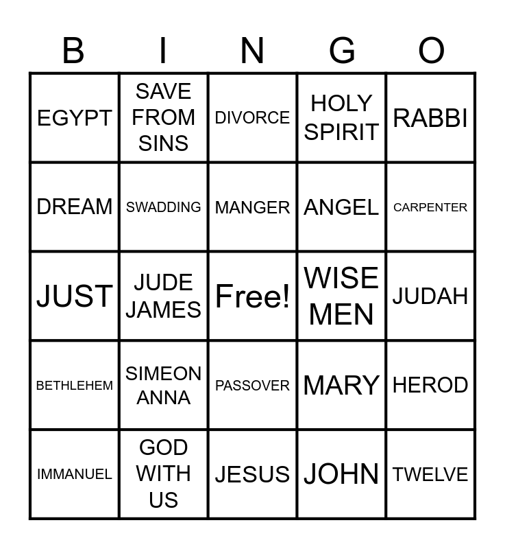This bingo card has a free space and 27 words: MARY, JOSEPH, ANGEL, JESUS, DREAM, DIVORCE, SAVE FROM SINS, BETHLEHEM, WISE MEN, HEROD, JUST, HOLY SPIRIT, IMMANUEL, GOD WITH US, CARPENTER, NAZARETH, SWADDING, MANGER, SIMEON ANNA, EGYPT, JUDAH, JOHN, JUDE JAMES, TWELVE, PASSOVER, RABBI and GABRIEL.