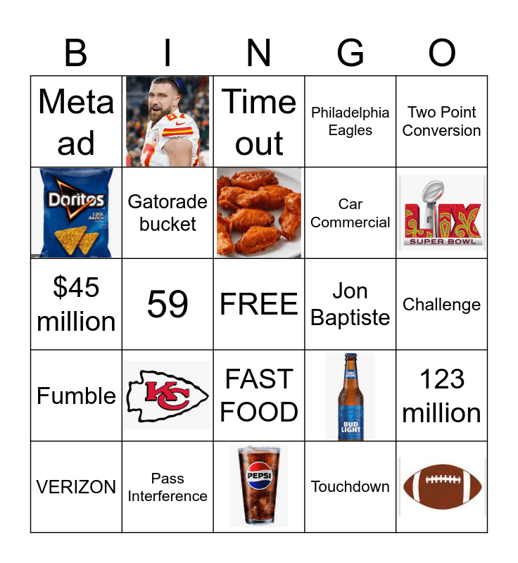 This bingo card has 18 images, a free space and 36 words: Kansas City Chiefs, Fumble, Punt, FAST FOOD, Pass, Philadelphia Eagles, MOVIE TRAILER, Meta ad, Interception, Pass Interference, VERIZON, Field Goal, Car Commercial, Trick Play, Challenge, Missed Field Goal, Jon Baptiste, Two Point Conversion, Touchdown, Offsides, Turnover, Time out, $7 million, $45 million, 123 million, Goal post, Gatorade bucket, Disney World, Winner, Loser, Bet, nachos, 59, MVP, $8,076 and New Orleans.