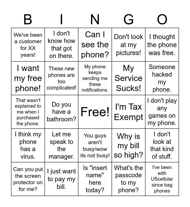 This bingo card has a free space and 29 words: Can you put the screen protector on for me?, Aur you guys T-Mobile yet?, Do you have a bathroom?, Can I get all my stuff off this phone?, We've been a customer for XX years!, Can I see the phone?, These new phones are too complicated!, Let me speak to the manager., I'm Tax Exempt, I just want to pay my bill., I don't play any games on my phone., I've been with UScellular since bag phones, Is "insert name" here today?, What's the passcode to my phone?, Someone hacked my phone., Can you waive my activation fee?, You guys aren't busy/wow its not busy!, I think my phone has a virus., I thought the phone was free., That wasn't explained to me when I purchased the phone., Why is my bill so high?, I need to sign my life away now?, My Service Sucks!, I want my free phone!, Don't look at my pictures!, I don't know how that got on there., I don't look at that kind of stuff., My phone keeps sending me these notifications. and How do I clean my phone?.
