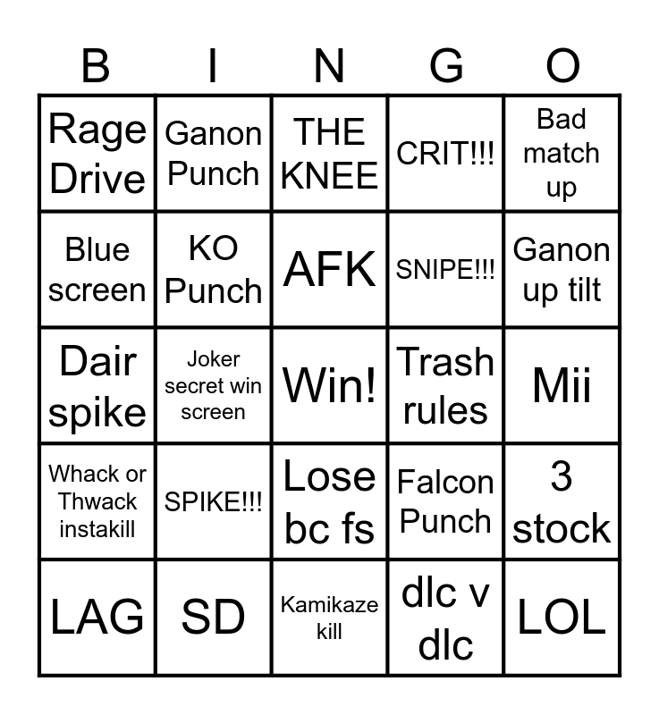 This bingo card has a free space and 24 words: SPIKE!!!, SD, AFK, LAG, Bad match up, Rage Drive, Blue screen, Ganon Punch, Trash rules, Lose bc fs, SNIPE!!!, Dair spike, Falcon Punch, 3 stock, KO Punch, dlc v dlc, Mii, THE KNEE, Ganon up tilt, Joker secret win screen, LOL, Whack or Thwack instakill, CRIT!!! and Kamikaze kill.