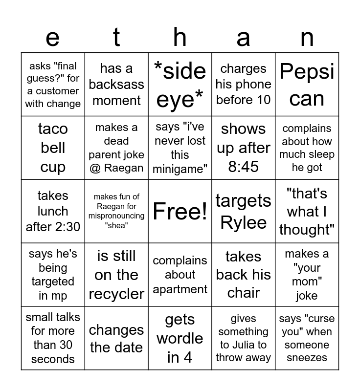 This bingo card has a free space and 24 words: is still on the recycler, changes the date, says "i've never lost this minigame", small talks for more than 30 seconds, Pepsi can, asks "final guess?" for a customer with change, taco bell cup, has a backsass moment, targets Rylee, complains about apartment, shows up after 8:45, takes lunch after 2:30, takes back his chair, makes a "your mom" joke, makes a dead parent joke @ Raegan, gives something to Julia to throw away, "that's what I thought", *side eye*, complains about how much sleep he got, makes fun of Raegan for mispronouncing "shea", says "curse you" when someone sneezes, says he's being targeted in mp, charges his phone before 10 and gets wordle in 4.