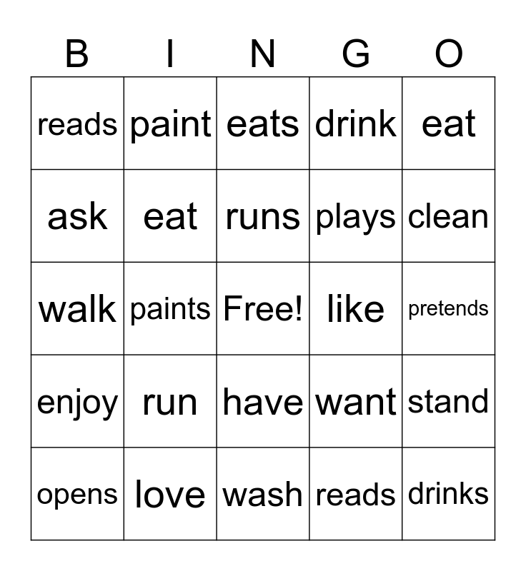 This bingo card has a free space and 24 words: run, love, runs, opens, eat, reads, ask, paint, like, have, plays, walk, want, stand, eat, reads, pretends, eats, clean, paints, drinks, enjoy, drink and wash.