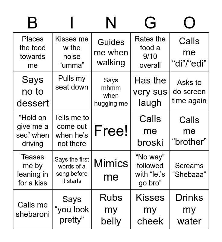 This bingo card has a free space and 24 words: Says the first words of a song before it starts, Says “you look pretty”, Says mhmm when hugging me, Calls me shebaroni, Calls me “di”/“edi”, Places the food towards me, Says no to dessert, Kisses me w the noise “umma”, Calls me broski, Mimics me, Has the very sus laugh, “Hold on give me a sec” when driving, “No way” followed with “let’s go bro”, Screams “Shebaaa”, Pulls my seat down, Kisses my cheek, Calls me “brother”, Guides me when walking, Asks to do screen time again, Tells me to come out when he’s not there, Drinks my water, Teases me by leaning in for a kiss, Rates the food a 9/10 overall and Rubs my belly.