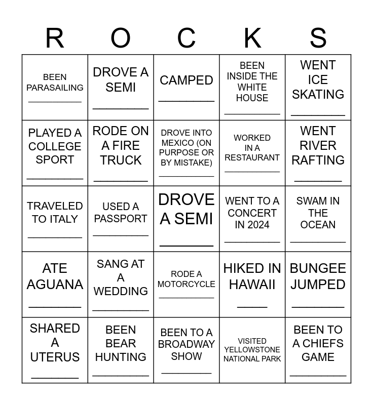 This bingo card has 30 words: BEEN BEAR HUNTING _________, BEEN TO THE NATIONAL FFA CONVENTION ___________, USED A PASSPORT __________, RODE IN A POLICE CAR __________, BEEN PARASAILING ___________, CAMPED ________, RODE ON A FIRE TRUCK ________, RODE A MOTORCYCLE ____________, WENT TO A CONCERT IN 2024 __________, BEEN TO A BROADWAY SHOW _________, SWAM IN THE OCEAN __________, DROVE A SEMI ______, VISITED YELLOWSTONE NATIONAL PARK, BEEN TO A CHIEFS GAME _________, WENT RIVER RAFTING _______, BEEN TO ALASKA _________, HIKED IN HAWAII ____, ATE AGUANA _______, SANG AT A WEDDING _________, WENT ICE SKATING ________, TRAVELED TO ITALY _________, BEEN TO THE TOP OF THE ARCH __________, DROVE A SEMI ________, WORKED IN A RESTAURANT ____________, PLAYED A COLLEGE SPORT _________, BEEN INSIDE THE WHITE HOUSE ___________, BUNGEE JUMPED _______, SHARED A UTERUS _______, DROVE INTO MEXICO (ON PURPOSE OR BY MISTAKE) ____________ and BEEN THE GRAND MARSHALL OF A PARADE ___________.