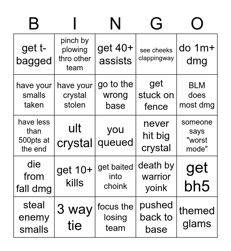 This bingo card has a free space and 24 words: get 10+ kills, 3 way tie, go to the wrong base, steal enemy smalls, do 1m+ dmg, get t-bagged, have your smalls taken, pinch by plowing thro other team, never hit big crystal, get baited into choink, get stuck on fence, have less than 500pts at the end, death by warrior yoink, get bh5, have your crystal stolen, pushed back to base, someone says "worst mode", get 40+ assists, BLM does most dmg, ult crystal, themed glams, die from fall dmg, see cheeks clappingway and focus the losing team.