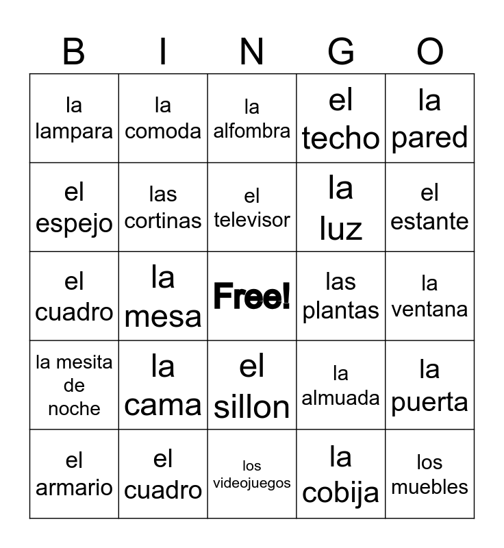 This bingo card has a free space and 24 words: el armario, la cama, el televisor, la cobija, la pared, la lampara, la comoda, la alfombra, las plantas, la ventana, el cuadro, las cortinas, la almuada, la puerta, el espejo, el cuadro, los videojuegos, el techo, el estante, la mesita de noche, la mesa, el sillon, la luz and los muebles.