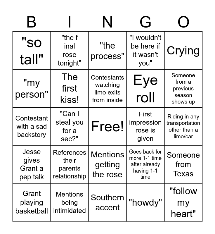 This bingo card has a free space and 32 words: "howdy", Wearing a costume, "Can I steal you for a sec?", Someone trips, Jesse gives Grant a pep talk, The first kiss!, Crying, Someone from Texas, "the final rose tonight", Upset about not getting 1-1 time yet, Contestants watching limo exits from inside, "the process", Grant singing, "whole package", First impression rose is given, Champagne toast, Grant playing basketball, Contestant with a sad backstory, Mentions getting the rose, References their parents relationship, Goes back for more 1-1 time after already having 1-1 time, Accused of being there for the wrong reasons, Riding in any transportation other than a limo/car, Mentions being intimidated, "follow my heart", "I wouldn't be here if it wasn't you", Eye roll, "my person", "so tall", Southern accent, Mentions Jenn and Someone from a previous season shows up.