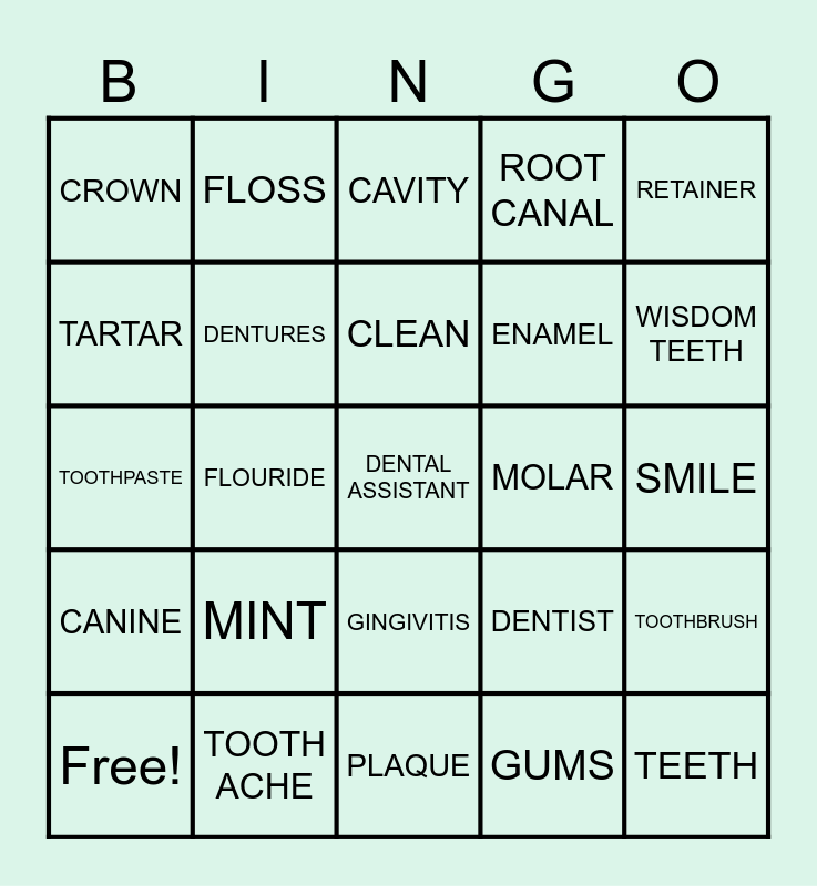 This bingo card has 27 words: DENTIST, TEETH, ENAMEL, PLAQUE, TARTAR, CAVITY, FLOSS, CANINE, MOLAR, TOOTHBRUSH, TOOTHPASTE, ROOT CANAL, Free!, TOOTH ACHE, WISDOM TEETH, WISDOM TEETH, DENTURES, CLEAN, MINT, CROWN, SMILE, GUMS, FLOURIDE, DENTAL ASSISTANT, GINGIVITIS, RETAINER and ORTHODONTIST.