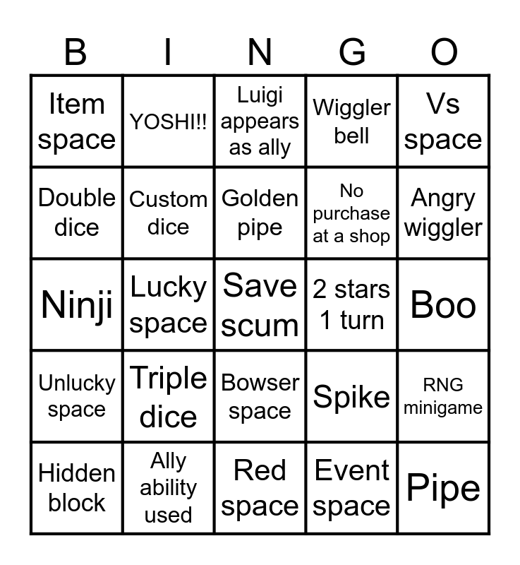 This bingo card has a free space and 24 words: Triple dice, Ally ability used, Golden pipe, Hidden block, Vs space, Item space, Double dice, YOSHI!!, 2 stars 1 turn, Bowser space, No purchase at a shop, Ninji, Spike, RNG minigame, Custom dice, Event space, Boo, Luigi appears as ally, Angry wiggler, Lucky space, Pipe, Unlucky space, Wiggler bell and Red space.