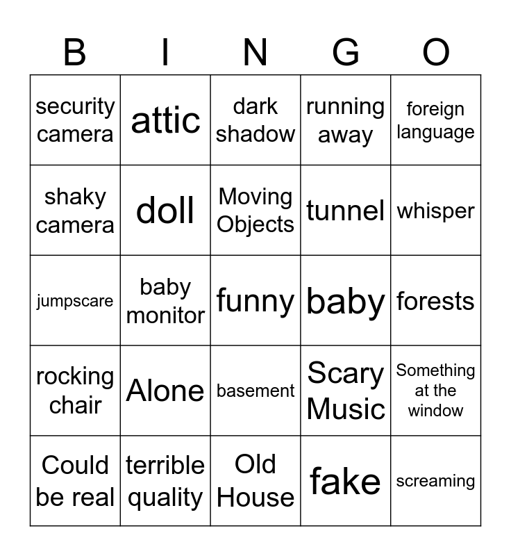 This bingo card has 25 words: Alone, Old House, Moving Objects, Could be real, foreign language, security camera, shaky camera, attic, baby, basement, tunnel, jumpscare, Scary Music, Something at the window, doll, screaming, forests, dark shadow, whisper, baby monitor, funny, terrible quality, rocking chair, running away and fake.