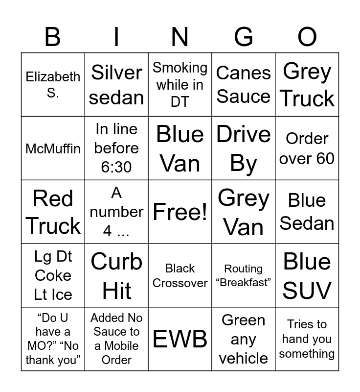 This bingo card has a free space and 86 words: Black SUV, Black Sedan, Black Crossover, Black Van, Black Truck, Black Coupe, White SUV, White Sedan, White Crossover, White Van, White Truck, White Coupe, Blue SUV, Blue Sedan, Blue Crossover, Blue Van, Blue Truck, Blue Coupe, Red SUV, Red Sedan, Red Crossover, Red Van, Red Truck, Red Coupe, Green any vehicle, Yellow any vehicle, Purple any vehicle, Orange any vehicle, Cannabis smell, Dog in Car, Added No Sauce to a Mobile Order, Mike and Pretzel, Delineator Hit, Curb Hit, McMuffin, Order over 40, Order over 60, Order Over 100, Fruit Cup, No Apple, A number 4 ..., Can I have ..., Grey crossover, Grey Sedan, Grey Van, Grey SUV, Grey Truck, Silver Crossover, Silver sedan, Silver Truck, Silver SUV, Silver Van, Still serving breakfast? After 10:30, Lg Dt Coke Lt Ice, Drives away B4 repeating order back, Rude customer, Passenger orders, Orders lunch B4 10:30 am, Drive By, Canes Sauce, In line before 6:30, Elizabeth S., Whisperer, Arby's Sauce, Cybertruck, Tesla, Smoking while in DT, Order under $4, Tries to hand you something, "Stay Warm", John in lobby, Police officer, “MO?”“Yes” when answer is No, “Do U have a MO?” “No thank you”, DD/UE in DT, MO Carryout in DT, Mocha crème cold brew, EWB, Catering p/u thru DT, > 2 steps away from DT door, 0 steps from DT door, Goes into lane 2 at DT door, Andrew B., Routing “Busy”, Routing “Busy Fries”, Routing “Breakfast” and Mile away tap to pay.
