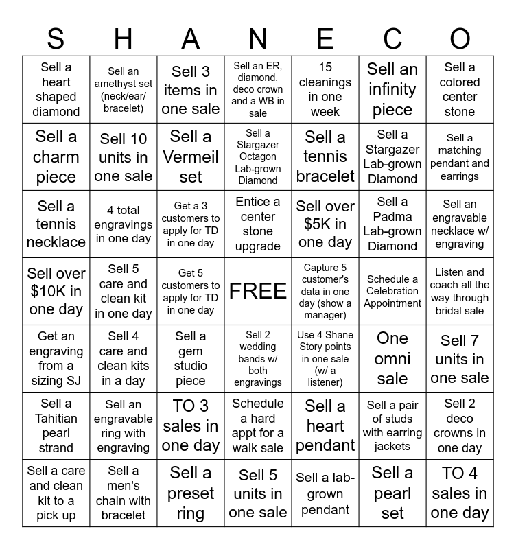 This bingo card has a free space and 48 words: Sell a heart pendant, Sell a Stargazer Lab-grown Diamond, Sell 5 units in one sale, Sell 5 care and clean kit in one day, Get a 3 customers to apply for TD in one day, Listen and coach all the way through bridal sale, Sell an amethyst set (neck/ear/ bracelet), Sell a men's chain with bracelet, Sell an infinity piece, Sell 2 wedding bands w/ both engravings, Sell a colored center stone, Sell an ER, diamond, deco crown and a WB in sale, Sell a Padma Lab-grown Diamond, Sell over $5K in one day, Sell a Tahitian pearl strand, Schedule a Celebration Appointment, Sell a charm piece, Sell a matching pendant and earrings, Sell a pair of studs with earring jackets, 15 cleanings in one week, Sell a tennis bracelet, Get 5 customers to apply for TD in one day, Sell a heart shaped diamond, Sell 10 units in one sale, Sell 2 deco crowns in one day, Sell a Vermeil set, Sell an engravable necklace w/ engraving, Sell a care and clean kit to a pick up, Entice a center stone upgrade, 4 total engravings in one day, Sell a pearl set, Capture 5 customer's data in one day (show a manager), Sell 7 units in one sale, Sell an engravable ring with engraving, Sell over $10K in one day, Use 4 Shane Story points in one sale (w/ a listener), One omni sale, Sell a tennis necklace, Sell a gem studio piece, TO 3 sales in one day, Get an engraving from a sizing SJ, TO 4 sales in one day, Sell 3 items in one sale, Sell a preset ring, Sell a Stargazer Octagon Lab-grown Diamond, Schedule a hard appt for a walk sale, Sell 4 care and clean kits in a day and Sell a lab-grown pendant.