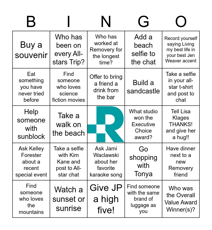 This bingo card has a free space and 24 words: Take a selfie with Kim Kane and post to All-star chat, Watch a sunset or sunrise, Offer to bring a friend a drink from the bar, Find someone who loves the mountains, Record yourself saying Living my best life in your best Jen Weaver accent, Buy a souvenir, Eat something you have never tried before, Who has been on every All-stars Trip?, What studio won the Executive Choice award?, Ask Jami Waclawski about her favorite karaoke song, Build a sandcastle, Help someone with sunblock, Go shopping with Tonya, Have dinner next to a new Removery friend, Find someone who loves science fiction movies, Find someone with the same brand of luggage as you, Tell Lisa Klages THANKS! and give her a hug!!, Who has worked at Removery for the longest time?, Take a selfie in your all-star t-shirt and post to chat, Take a walk on the beach, Who was the Overall Value Award Winner(s)?, Ask Kelley Forester about a recent special event, Add a beach selfie to the chat and Give JP a high five!.