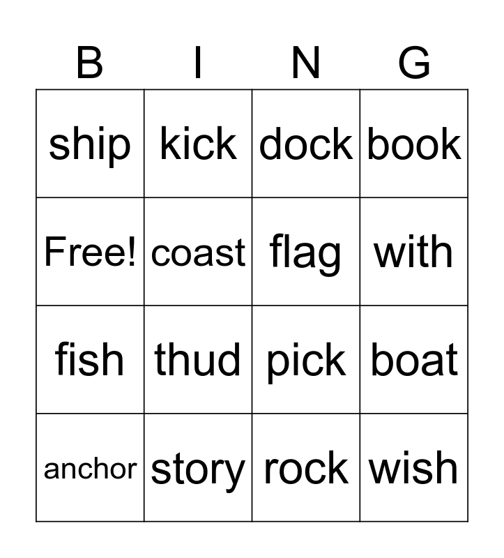 This bingo card has 16 words: story, boat, dock, ship, fish, kick, pick, rock, Free!, coast, anchor, book, thud, with, flag and wish.