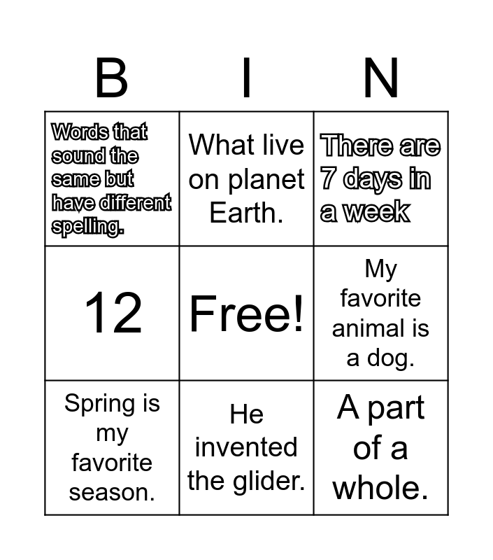 This bingo card has a free space and 8 words: My favorite animal is a dog., There are 7 days in a week, What live on planet Earth., Spring is my favorite season., Words that sound the same but have different spelling., A part of a whole., 12 and He invented the glider..