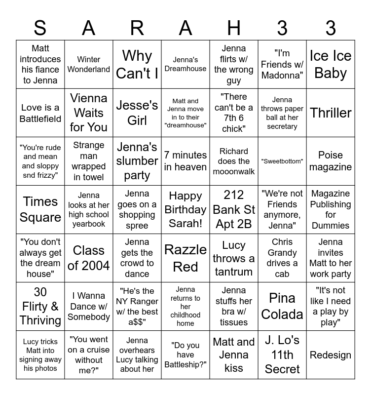 This bingo card has a free space and 48 words: Jenna stuffs her bra w/ tissues, Jenna throws paper ball at her secretary, "Do you have Battleship?", Jenna looks at her high school yearbook, Jenna's slumber party, Magazine Publishing for Dummies, Winter Wonderland, "You went on a cruise without me?", "I'm Friends w/ Madonna", Razzle Red, Ice Ice Baby, Jenna's Dreamhouse, "Sweetbottom", Richard does the mooonwalk, 30 Flirty & Thriving, "We're not Friends anymore, Jenna", Love is a Battlefield, Thriller, Pina Colada, Jenna flirts w/ the wrong guy, "There can't be a 7th 6 chick", Jenna goes on a shopping spree, Matt introduces his fiance to Jenna, Vienna Waits for You, "It's not like I need a play by play", Jesse's Girl, Poise magazine, Lucy tricks Matt into signing away his photos, 7 minutes in heaven, Strange man wrapped in towel, J. Lo's 11th Secret, 212 Bank St Apt 2B, Jenna invites Matt to her work party, I Wanna Dance w/ Somebody, Times Square, Lucy throws a tantrum, Chris Grandy drives a cab, "You're rude and mean and sloppy snd frizzy", Jenna gets the crowd to dance, "He's the NY Ranger w/ the best a$$", "You don't always get the dream house", Redesign, Why Can't I, Jenna overhears Lucy talking about her, Matt and Jenna move in to their "dreamhouse", Jenna returns to her childhood home, Class of 2004 and Matt and Jenna kiss.