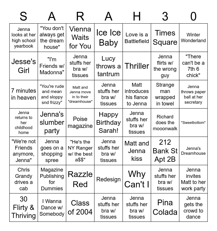 This bingo card has a free space and 55 words: Jenna stuffs her bra w/ tissues, Jenna throws paper ball at her secretary, "Do you have Battleship?", Jenna looks at her high school yearbook, Jenna's slumber party, Magazine Publishing for Dummies, Winter Wonderland, "You went on a cruise without me?", "I'm Friends w/ Madonna", Razzle Red, Ice Ice Baby, Jenna's Dreamhouse, "Sweetbottom", Richard does the mooonwalk, 30 Flirty & Thriving, "We're not Friends anymore, Jenna", Love is a Battlefield, Thriller, Pina Colada, Jenna flirts w/ the wrong guy, "There can't be a 7th 6 chick", Jenna goes on a shopping spree, Matt introduces his fiance to Jenna, Vienna Waits for You, "It's not like I need a play by play", Jesse's Girl, Poise magazine, Lucy tricks Matt into signing away his photos, 7 minutes in heaven, Strange man wrapped in towel, J. Lo's 11th Secret, 212 Bank St Apt 2B, Jenna invites Matt to her work party, I Wanna Dance w/ Somebody, Times Square, Lucy throws a tantrum, Chris Grandy drives a cab, "You're rude and mean and sloppy snd frizzy", Jenna gets the crowd to dance, "He's the NY Ranger w/ the best a$$", "You don't always get the dream house", Redesign, Why Can't I, Jenna overhears Lucy talking about her, Matt and Jenna move in to their "dreamhouse", Jenna returns to her childhood home, Class of 2004, Matt and Jenna kiss, Jenna stuffs her bra w/ tissues, Jenna stuffs her bra w/ tissues, Jenna stuffs her bra w/ tissues, Jenna stuffs her bra w/ tissues, Jenna stuffs her bra w/ tissues, Jenna stuffs her bra w/ tissues and Jenna stuffs her bra w/ tissues.