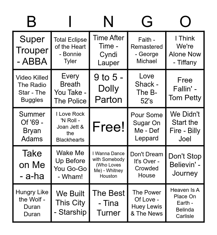 This bingo card has a free space and 68 words: Dancing In the Dark - Bruce Springsteen, Heaven Is A Place On Earth - Belinda Carlisle, Like a Prayer - Madonna, Uptown Girl - Billy Joel, Edge of Seventeen - Stevie Nicks, Don't You (Forget About Me) - Simple Minds, Total Eclipse of the Heart - Bonnie Tyler, Material Girl - Madonna, 9 to 5 - Dolly Parton, Jessie's Girl - Rick Springfield, I Wanna Dance with Somebody (Who Loves Me) - Whitney Houston, Running Up That Hill (A Deal With God) - Kate Bush, We Didn't Start the Fire - Billy Joel, I Think We're Alone Now - Tiffany, Call Me - Blondie, Video Killed The Radio Star - The Buggles, I Love Rock 'N Roll - Joan Jett & the Blackhearts, Super Trouper - ABBA, I'm Still Standing - Elton John, Wake Me Up Before You Go-Go - Wham!, Love Shack - The B-52's, Don't Dream It's Over - Crowded House, Take on Me - a-ha, I Still Haven't Found What I'm Looking For - U2, Footloose - Kenny Loggins, Walking On Sunshine - Katrina & The Waves, Tainted Love - Soft Cell, You Give Love A Bad Name - Bon Jovi, Don't Stop Believin' - Journey, I'm Gonna Be (500 Miles) - The Proclaimers, Time After Time - Cyndi Lauper, Forever Young - Alphaville, Should I Stay or Should I Go - The Clash, Maneater - Daryl Hall & John Oates, Faith - Remastered - George Michael, You Make My Dreams (Come True) - Daryl Hall & John Oates, If I Could Turn Back Time - Cher, Hungry Like the Wolf - Duran Duran, Free Fallin' - Tom Petty, Summer Of '69 - Bryan Adams, You Spin Me Round (Like a Record) - Dead Or Alive, 99 Luftballons - Nena, Every Breath You Take - The Police, How Will I Know - Whitney Houston, Black Velvet - Alannah Myles, Ghostbusters - Ray Parker Jr., Never Tear Us Apart - INXS, Manic Monday - The Bangles, Pour Some Sugar On Me - Def Leppard, We Built This City - Starship, Eternal Flame - The Bangles, Kiss - Prince, Just Can't Get Enough - Depeche Mode, The Best - Tina Turner, Karma Chameleon - Culture Club, Another One Bites The Dust - Queen, The Power Of Love - Huey Lewis & The News, Abracadabra - Steve Miller Band, (I Just) Died In Your Arms - Cutting Crew, Never Gonna Give You Up - Rick Astley, Invisible Touch - Genesis, You Can't Hurry Love - Phil Collins, I'm Coming Out - Diana Ross, Back In Black - AC/DC, Paradise City - Guns N' Roses, Jack & Diane - John Mellencamp, Listen To Your Heart - Roxette and I'm So Excited - The Pointer Sisters.