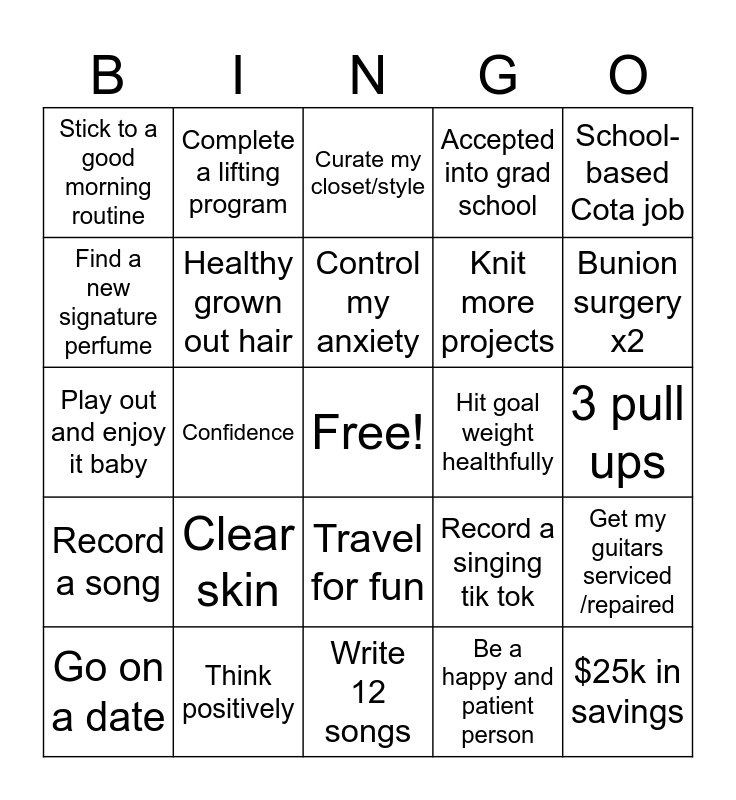 This bingo card has a free space and 24 words: Clear skin, Think positively, Control my anxiety, Go on a date, School-based Cota job, Stick to a good morning routine, Find a new signature perfume, Complete a lifting program, Hit goal weight healthfully, Travel for fun, Knit more projects, Play out and enjoy it baby, Record a singing tik tok, Get my guitars serviced /repaired, Healthy grown out hair, Be a happy and patient person, 3 pull ups, Curate my closet/style, Bunion surgery x2, Confidence, $25k in savings, Record a song, Accepted into grad school and Write 12 songs.