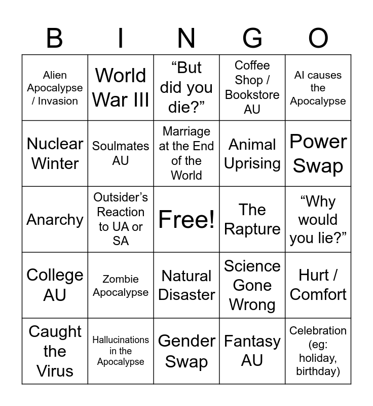 This bingo card has a free space and 24 words: Zombie Apocalypse, Hallucinations in the Apocalypse, Marriage at the End of the World, Caught the Virus, AI causes the Apocalypse, Alien Apocalypse / Invasion, Nuclear Winter, World War III, The Rapture, Natural Disaster, Animal Uprising, Anarchy, Science Gone Wrong, Hurt / Comfort, Soulmates AU, Fantasy AU, “Why would you lie?”, “But did you die?”, Power Swap, Outsider’s Reaction to UA or SA, Celebration (eg: holiday, birthday), College AU, Coffee Shop / Bookstore AU and Gender Swap.
