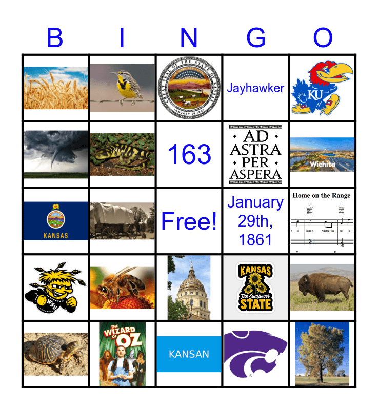 This bingo card has 21 images, a free space and 3 words: 163, January 29th, 1861 and Jayhawker.