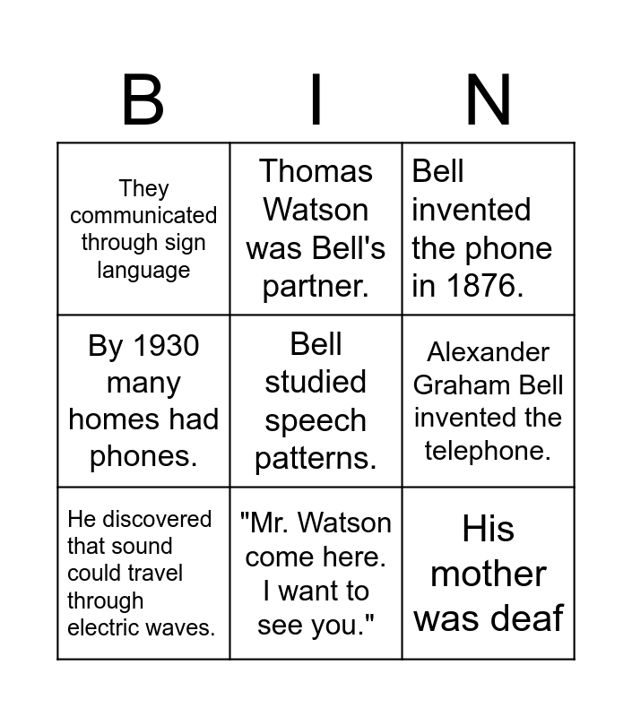 This bingo card has a free space and 8 words: Alexander Graham Bell invented the telephone., Bell invented the phone in 1876., Thomas Watson was Bell's partner., He discovered that sound could travel through electric waves., They communicated through sign language, His mother was deaf, By 1930 many homes had phones. and "Mr. Watson come here. I want to see you.".