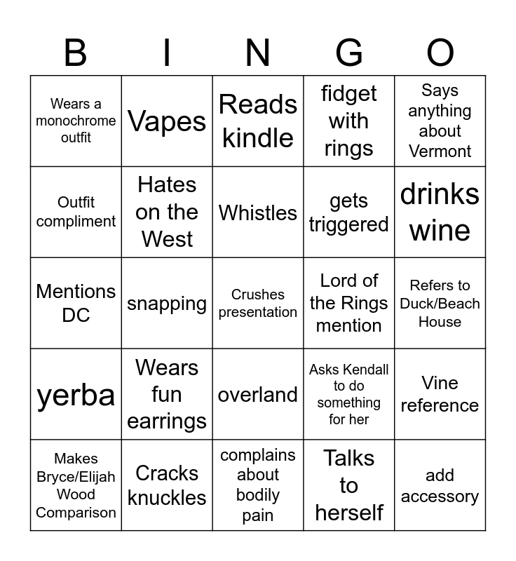 This bingo card has a free space and 24 words: Makes Bryce/Elijah Wood Comparison, Wears fun earrings, Whistles, Talks to herself, Says anything about Vermont, Wears a monochrome outfit, Vapes, Reads kindle, Lord of the Rings mention, Refers to Duck/Beach House, Mentions DC, Hates on the West, Asks Kendall to do something for her, Vine reference, Outfit compliment, Cracks knuckles, complains about bodily pain, fidget with rings, drinks wine, yerba, snapping, overland, gets triggered and add accessory.