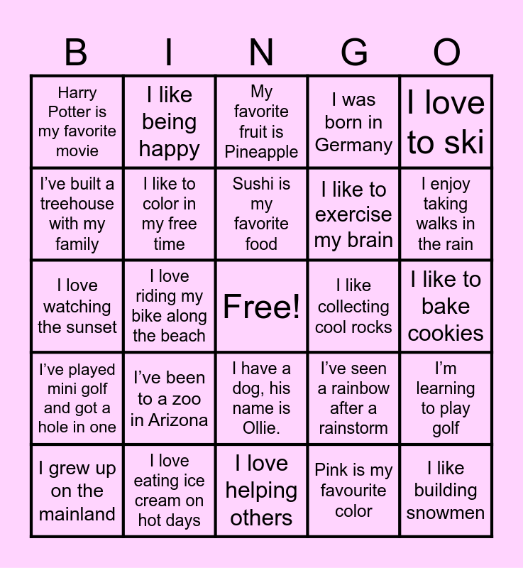 This bingo card has a free space and 42 words: I love swimming in the lake, Sushi is my favorite food, I can ride a skateboard, I’ve been to a zoo in Arizona, Pink is my favourite color, I’m learning to play golf, I like building snowmen, I love playing card games, My favorite fruit is Pineapple, I have a dog, his name is Ollie., I like to bake cookies, I enjoy taking walks in the rain, I love riding my bike along the beach, I love to ski, I can do a cartwheel, I’ve seen a rainbow after a rainstorm, I enjoy playing Minecraft, I love watching the sunset, I ask a lot of questions, I like being happy, I’ve built a treehouse with my family, I used to play the saxophone in school, I’m left-handed, Harry Potter is my favorite movie, I’ve seen a bear in the wild before!, I enjoy listening to country music, I like to exercise my brain, I go camping whenever I can, I love adventuring, I can’t whistle, Spring is my favorite season, I’ve played mini golf and got a hole in one, I like to color in my free time, I love helping others, I’m afraid of seaweed, I grew up on the mainland, I love eating ice cream on hot days, I like collecting cool rocks, I love playing with puzzles, I like collecting mugs, I was born in Germany and I love camping and exploring new trails.
