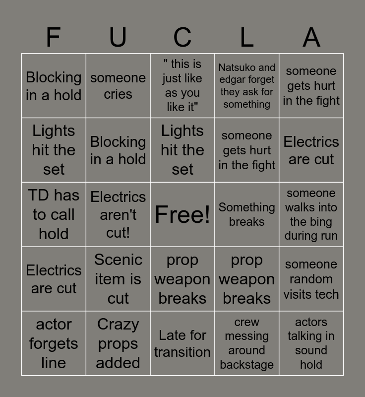 This bingo card has a free space and 39 words: Something breaks, Scenic item is cut, Someone forgets they are the reason for the hold, Blocking in a hold, actor forgets line, prop weapon breaks, Lights hit the set, Late for transition, someone gets hurt in the fight, Electrics are cut, Electrics aren't cut!, Natsuko and edgar forget they ask for something, actors talking in sound hold, someone walks into the bing during run, Something breaks, Scenic item is cut, Someone forgets they are the reason for the hold, Blocking in a hold, actor forgets line, prop weapon breaks, Lights hit the set, Late for transition, someone gets hurt in the fight, Electrics are cut, Electrics aren't cut!, Natsuko and edgar forget they ask for something, actors talking in sound hold, someone walks into the bing during run, costume added after first dress, someone cries, Drastically off spike, "what is this show about", " this is just like as you like it", Crazy props added, crew messing around backstage, "this show is so weird", someone random visits tech, TD has to call hold and it rains and actors enter wet.