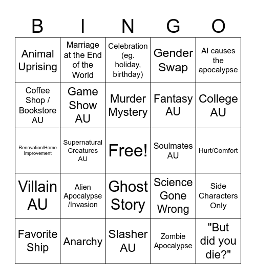 This bingo card has a free space and 24 words: Alien Apocalypse /Invasion, Anarchy, Murder Mystery, Favorite Ship, AI causes the apocalypse, Animal Uprising, Coffee Shop / Bookstore AU, Marriage at the End of the World, Soulmates AU, Ghost Story, Fantasy AU, Renovation/Home Improvement, Science Gone Wrong, Side Characters Only, Game Show AU, Zombie Apocalypse, Hurt/Comfort, Celebration (eg. holiday, birthday), College AU, Supernatural Creatures AU, "But did you die?", Villain AU, Gender Swap and Slasher AU.
