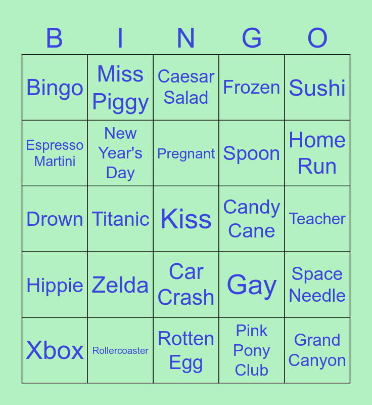 This bingo card has a free space and 29 words: Xbox, Travis Kelce, Titanic, Dungeon, Bingo, Caesar Salad, New Year's Day, Zelda, Candy Cane, Rollercoaster, Teacher, Grand Canyon, Rotten Egg, Pink Pony Club, Home Run, Uber, Car Crash, Hippie, Sushi, Drown, Gay, Yellow Brick Road, Spoon, Espresso Martini, Frozen, Miss Piggy, Space Needle, Pregnant and Podcast.