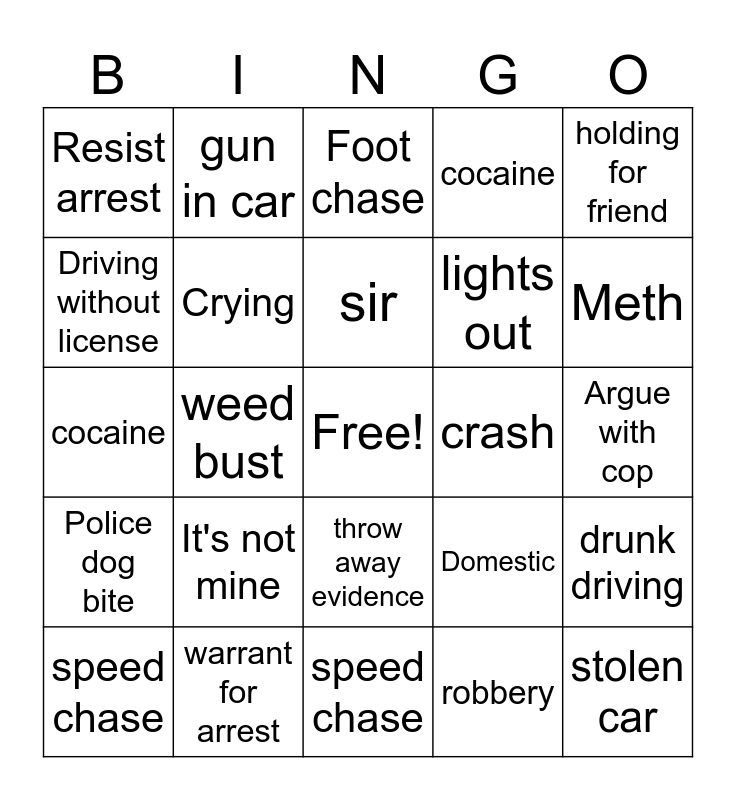 This bingo card has a free space and 24 words: It's not mine, warrant for arrest, sir, speed chase, holding for friend, Resist arrest, Driving without license, gun in car, crash, throw away evidence, lights out, cocaine, Domestic, drunk driving, Crying, robbery, Argue with cop, Foot chase, Meth, weed bust, stolen car, Police dog bite, cocaine and speed chase.