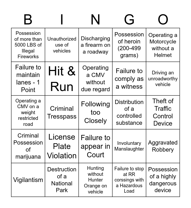 This bingo card has 147 words: Free!, 1st Degree Murder, 2nd Degree Murder, 3rd Degree Murder, Voluntary Manslaughter, Involuntary Manslaughter, Aggravated Battery, Domestic Violence, False Imprisonment, Kidnapping, Torture, Human Trafficking, Violation of Restraining Order, Mayhem, Disorderly Conduct, Stalking, Harassment, Abuse of Corpse, Improper Disposal of Body, Reckless Damage or Destruction, Robbery, Aggravated Robbery, Burglary, Grand Theft Auto, Carjacking, Criminal Tresspass, Unauthorized use of vehicles, Vandalism, Forgery, Loitering, False Statement to obtain Property, Destruction of Traffic Control Device(s), Destruction to Private Property, Theft of Traffic Control Device, Unintentional Cause of a Fire, Tampering with Evidence, Tampering with Witness, False Police Report, Failure to comply as a witness, Perjury, Contempt of Court, Failure to pay Fine, Failure to appear in Court, Providing False information, Failure to provide an ID, Interfering with a Search & Seizure, Obstruction of Justice, Accessory after the fact, Accessory during the crime, Murder of a Peace Officer, Failure to provide breath/blood sample, Lying on a State Record, Vigilantism, Faillure to give a Breath Sample, Interfering with a Fire Marshall, Unlawful Carry of a Firearm in a Restricted Area, Felon in possession of body armor, Possession of a prohibited weapon, Unlawful transfer or gain of a firearm, Unlawful Display of a Firearm, Discharging a firearm on a roadway, Possession of a highly dangerous device, Possession of an Unregistered firearm, Distributation of a firearm without proper license, Possession of an illegal weapon, Distribution of a controlled substance, Criminal Possession of marijuana, Criminal Distributation of marijuana, Conspiracy to Commit, Possession of a Firearm while Under the Influence, Failure to Provide Federal Firearm License, Possession of 0-24 LBS Illegal Fireworks, Possession of more than 5000 LBS of Illegal Fireworks, Discharge of Illegal Fireworks within a National Park, Forgering of Legal Documents, Obstruction of Medical Care, Drug Trafficking, Possession of Fentanyl (1-99 grams), Possession of Fentanyl (500+ grams), Possession of heroin (200-499 grams), Possession of Heroin (500+ grams), Taking or attempting to take a weapon from a peace officer, Possession of a Firearm during the Commission of a Crime, Animal Abuse, Hunting on Probation, Hunting under the influence, Poaching, Hunting/Fishing on Expired/Suspended/Revoked or no License, Operating ATV on walking trails, Hunting without Hunter Orange on vehicle, Operating an All-Terrain Vehicle with a Passenger, Operating an All-Terrain Vehicle within a Stream or River, Operating Water Vehicle while under the Influence, Vandalism of a National Park, Destruction of a National Park, Littering in a National Park, Injuring an endangered animal, Removing Endangered animals from natural habitat, Driving with expired tags & registration, Speeding 1+ MPH over the limit - 1 Point, Failure to display headlights, Operating a motor vehicle with unsecured passengers, Failure to maintain lanes - 1 Point, Illegal overtake - 1 Point, Illegal U-Turn, Failure to Yield right of way, Failure to obey traffic control devices - 1 Point, Obstructing Highway or Passageway, Unnecessary Use of Horn, Window Tint Violation, Illegal Headlights, Illegal Underglow, Hit & Run, License Plate Violation, Illegal Parking, Driving an unroadworthy vehicle, Failure to Yield to Pedestrian, Following too Closely, Operating a Motorcycle without a Helmet, Operating an All-Terrain Vehicle on a Roadway/Highway, Operating a CMV on a weight restricted road, Operating a CMV without the proper permits, Possession of prohibited items inside CMV, Operating a CMV without due regard, Refusing an officer's cargo search, Bypassing CMV Inspection Station, Failure to stop at RR corssings with a Hazardous Load, Operating Unsafely in adverse road conditions, Drive By Shooting, Violence at International Airports, Commercial Vehicle failing to stop for inspections, Operating an Aircraft Without a Valid License, Unauthorized Surveillance or Spying, Failure to Report an Aviation Incident, Illegal Use of Unmanned Aircraft (Drones), Hunting, Fishing, Trapping or Disturbing/Injuring Wildlife Reguges, Use of Aircraft or Motor Vehicles to hunt animals, Assaulting, resisting, or impeding certain officers or employees, Assault or Battery of a Foreign Official, Unlawful Distribution of Firearm(s), Use of Restricted Ammunition, Murder, Manslaughter, Murder of Foreign Officials, Murder by Escaped Prisoners, Killing a person aiding in Federal or State Investigation and Taking a Hostage.