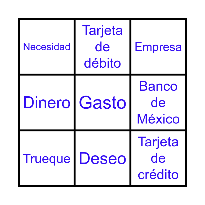 This bingo card has 17 words: Finanzas, Emprendedor, Empresa, Necesidad, Ahorro, Dinero, Sueldo, Trueque, Deseo, Banco de México, Ingreso, Interés, Gasto, Tarjeta de débito, Tarjeta de crédito, Criptomonedas and Honorarios.