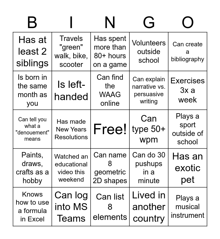 This bingo card has a free space and 24 words: Watched an educational video this weekend, Can log into MS Teams, Can find the WAAG online, Knows how to use a formula in Excel, Can create a bibliography, Has at least 2 siblings, Is born in the same month as you, Travels "green" walk, bike, scooter, Can type 50+ wpm, Can name 8 geometric 2D shapes, Can explain narrative vs. persuasive writing, Can tell you what a "denouement" means, Can do 30 pushups in a minute, Has an exotic pet, Is left-handed, Lived in another country, Plays a sport outside of school, Has spent more than 80+ hours on a game, Exercises 3x a week, Has made New Years Resolutions, Plays a musical instrument, Paints, draws, crafts as a hobby, Volunteers outside school and Can list 8 elements.