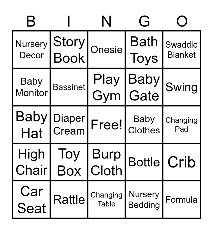 This bingo card has a free space and 24 words: Toy Box, Rattle, Play Gym, Car Seat, Swaddle Blanket, Nursery Decor, Baby Monitor, Story Book, Baby Clothes, Burp Cloth, Baby Gate, Baby Hat, Bottle, Crib, Bassinet, Nursery Bedding, Changing Pad, Onesie, Swing, Diaper Cream, Formula, High Chair, Bath Toys and Changing Table.