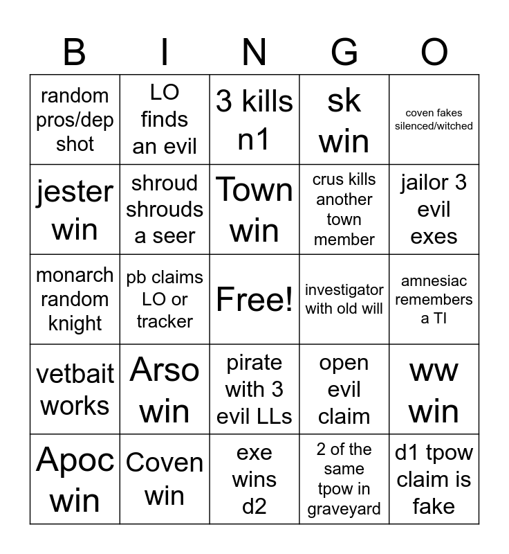 This bingo card has a free space and 24 words: Arso win, Coven win, Town win, Apoc win, coven fakes silenced/witched, random pros/dep shot, jester win, LO finds an evil, investigator with old will, pirate with 3 evil LLs, crus kills another town member, monarch random knight, open evil claim, ww win, shroud shrouds a seer, 2 of the same tpow in graveyard, amnesiac remembers a TI, 3 kills n1, jailor 3 evil exes, pb claims LO or tracker, d1 tpow claim is fake, vetbait works, sk win and exe wins d2.