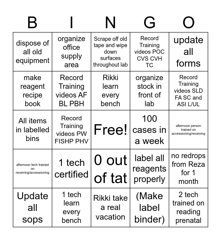 This bingo card has a free space and 24 words: 1 tech certified, 1 tech learn every bench, Rikki learn every bench, Update all sops, update all forms, dispose of all old equipment, make reagent recipe book, organize office supply area, 100 cases in a week, 0 out of tat, organize stock in front of lab, All items in labelled bins, label all reagents properly, no redrops from Reza for 1 month, Record Training videos AF BL PBH, (Make label binder), afternoon person trained on accessioning/receiving, Scrape off old tape and wipe down surfaces throughout lab, Record Training videos SLD FA SC and ASI L/UL, Record Training videos PW FISHP PHV, 2 tech trained on reading prenatal, afternoon tech trained on receiving/accessioning, Record Training videos POC CVS CVH TC and Rikki take a real vacation.