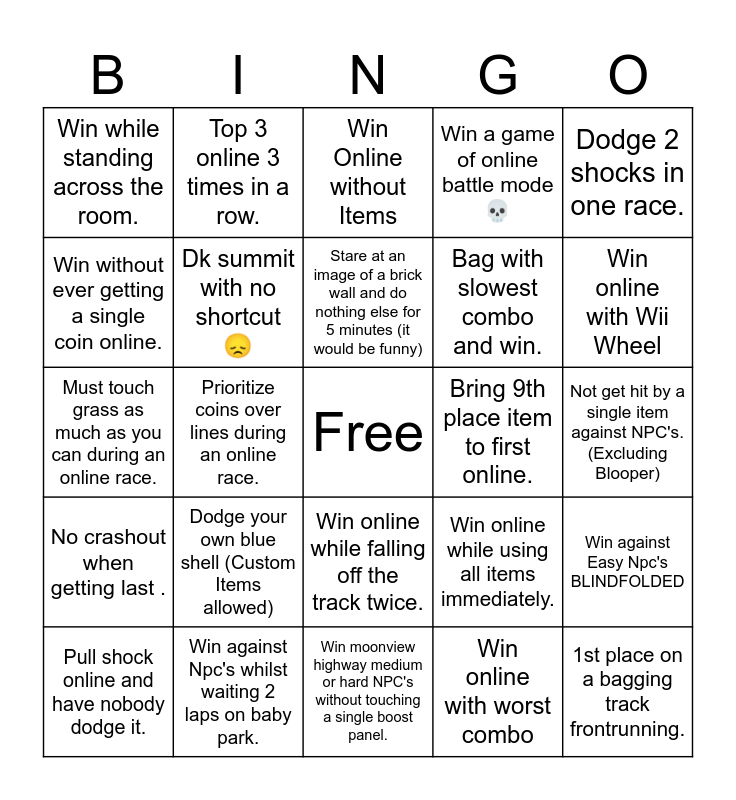 This bingo card has a free space and 24 words: Dodge your own blue shell (Custom Items allowed), Win against Npc's whilst waiting 2 laps on baby park., Stare at an image of a brick wall and do nothing else for 5 minutes (it would be funny), Pull shock online and have nobody dodge it., Dodge 2 shocks in one race., Win while standing across the room., Win without ever getting a single coin online., Top 3 online 3 times in a row., Bring 9th place item to first online., Win online while falling off the track twice., Bag with slowest combo and win., Must touch grass as much as you can during an online race., Win online while using all items immediately., Win against Easy Npc's BLINDFOLDED, Dk summit with no shortcut 😞, Win online with worst combo, Not get hit by a single item against NPC's. (Excluding Blooper), Win Online without Items, Win online with Wii Wheel, Prioritize coins over lines during an online race., 1st place on a bagging track frontrunning., No crashout when getting last ., Win a game of online battle mode 💀 and Win moonview highway medium or hard NPC's without touching a single boost panel..