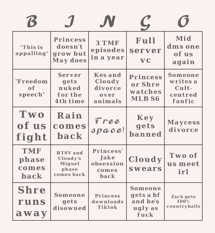 This bingo card has a free space and 32 words: 𝐒𝐨𝐦𝐞𝐨𝐧𝐞 𝐠𝐞𝐭𝐬 𝐚 𝐛𝐟 𝐚𝐧𝐝 𝐡𝐞'𝐬 𝐮𝐠𝐥𝐲 𝐚𝐬 𝐟𝐮𝐜𝐤, 𝐒𝐨𝐦𝐞𝐨𝐧𝐞 𝐥𝐞𝐚𝐯𝐞𝐬 (𝐭𝐞𝐦𝐩) 𝐛𝐞𝐜𝐚𝐮𝐬𝐞 𝐨𝐟 𝐬𝐜𝐡𝐨𝐨𝐥, 𝐑𝐚𝐢𝐧 𝐜𝐨𝐦𝐞𝐬 𝐛𝐚𝐜𝐤, 𝐀𝐛𝐛𝐲 𝐛𝐞𝐜𝐨𝐦𝐞𝐬 𝐟𝐫𝐞𝐚𝐤𝐢𝐞𝐫, 𝐓𝐌𝐅 𝐩𝐡𝐚𝐬𝐞 𝐜𝐨𝐦𝐞𝐬 𝐛𝐚𝐜𝐤, 𝐒𝐞𝐫𝐯𝐞𝐫 𝐠𝐞𝐭𝐬 𝐧𝐮𝐤𝐞𝐝 𝐟𝐨𝐫 𝐭𝐡𝐞 𝟒𝐭𝐡 𝐭𝐢𝐦𝐞, 𝐌𝐢𝐝 𝐝𝐦𝐬 𝐨𝐧𝐞 𝐨𝐟 𝐮𝐬 𝐚𝐠𝐚𝐢𝐧, 𝐓𝐰𝐨 𝐨𝐟 𝐮𝐬 𝐦𝐞𝐞𝐭 𝐢𝐫𝐥, 𝐏𝐫𝐢𝐧𝐜𝐞𝐬𝐬 𝐝𝐨𝐞𝐬𝐧'𝐭 𝐠𝐫𝐨𝐰 𝐛𝐮𝐭 𝐌𝐚𝐲 𝐝𝐨𝐞𝐬, 𝐂𝐥𝐨𝐮𝐝𝐲 𝐭𝐚𝐥𝐤𝐬 𝐭𝐨 𝐚 𝐫𝐞𝐚𝐥 𝐠𝐮𝐲, 𝐊𝐞𝐬 𝐚𝐧𝐝 𝐂𝐥𝐨𝐮𝐝𝐲 𝐝𝐢𝐯𝐨𝐫𝐜𝐞 𝐨𝐯𝐞𝐫 𝐚𝐧𝐢𝐦𝐚𝐥𝐬, 𝟑 𝐓𝐌𝐅 𝐞𝐩𝐢𝐬𝐨𝐝𝐞𝐬 𝐢𝐧 𝐚 𝐲𝐞𝐚𝐫, 𝐑𝐚𝐢𝐧 𝐚𝐬𝐤𝐬 𝐭𝐨 𝐜𝐨𝐦𝐞 𝐛𝐚𝐜𝐤 𝐝𝐮𝐫𝐢𝐧𝐠 𝐅𝐞𝐛/𝐌𝐚𝐫𝐜𝐡, 𝐏𝐫𝐢𝐧𝐜𝐞𝐬𝐬 𝐥𝐞𝐚𝐯𝐞𝐬 𝐚𝐠𝐚𝐢𝐧, 𝐊𝐞𝐲 𝐠𝐞𝐭𝐬 𝐛𝐚𝐧𝐧𝐞𝐝, 𝟐𝟎𝟐𝟓 𝐰𝐫𝐚𝐩𝐩𝐞𝐝 𝐢𝐬 𝐰𝐞𝐢𝐫𝐝 𝐚𝐬 𝐟𝐮𝐜𝐤, 𝐒𝐡𝐫𝐞 𝐫𝐮𝐧𝐬 𝐚𝐰𝐚𝐲, 𝐓𝐰𝐨 𝐨𝐟 𝐮𝐬 𝐟𝐢𝐠𝐡𝐭, 𝐏𝐫𝐢𝐧𝐜𝐞𝐬𝐬' 𝐉𝐚𝐤𝐞 𝐨𝐛𝐬𝐞𝐬𝐬𝐢𝐨𝐧 𝐜𝐨𝐦𝐞𝐬 𝐛𝐚𝐜𝐤, 𝐁𝐓𝐒𝐕 𝐚𝐧𝐝 𝐂𝐥𝐨𝐮𝐝𝐲'𝐬 𝐌𝐢𝐠𝐮𝐞𝐥 𝐩𝐡𝐚𝐬𝐞 𝐜𝐨𝐦𝐞𝐬 𝐛𝐚𝐜𝐤, 𝐂𝐥𝐨𝐮𝐝𝐲 𝐬𝐰𝐞𝐚𝐫𝐬, 𝐁𝐥𝐨𝐜𝐤𝐢𝐧𝐠 𝐫𝐚𝐢𝐝 𝐩𝐭𝟑, 𝐌𝐚𝐲𝐜𝐞𝐬𝐬 𝐝𝐢𝐯𝐨𝐫𝐜𝐞, 𝐒𝐨𝐦𝐞𝐨𝐧𝐞 𝐠𝐞𝐭𝐬 𝐝𝐢𝐬𝐨𝐰𝐧𝐞𝐝, 𝐙𝐚𝐜𝐡 𝐠𝐞𝐭𝐬 𝟏𝟎𝟎% 𝐜𝐨𝐮𝐧𝐭𝐫𝐲𝐛𝐚𝐥𝐥𝐬, 𝐅𝐮𝐥𝐥 𝐬𝐞𝐫𝐯𝐞𝐫 𝐯𝐜, 𝐏𝐫𝐢𝐧𝐜𝐞𝐬𝐬 𝐨𝐫 𝐒𝐡𝐫𝐞 𝐰𝐚𝐭𝐜𝐡𝐞𝐬 𝐌𝐋𝐁 𝐒𝟔, "𝐅𝐫𝐞𝐞𝐝𝐨𝐦 𝐨𝐟 𝐬𝐩𝐞𝐞𝐜𝐡", "𝐓𝐡𝐢𝐬 𝐢𝐬 𝐚𝐩𝐩𝐚𝐥𝐥𝐢𝐧𝐠", 𝐏𝐫𝐢𝐧𝐜𝐞𝐬𝐬 𝐝𝐨𝐰𝐧𝐥𝐨𝐚𝐝𝐬 𝐓𝐢𝐤𝐭𝐨𝐤, 𝐊𝐞𝐲 𝐠𝐢𝐯𝐞𝐬 𝐒𝐡𝐫𝐞 𝐒𝐚𝐮𝐝𝐢 and 𝐒𝐨𝐦𝐞𝐨𝐧𝐞 𝐰𝐫𝐢𝐭𝐞𝐬 𝐚 𝐂𝐮𝐥𝐭-𝐜𝐞𝐧𝐭𝐫𝐞𝐝 𝐟𝐚𝐧𝐟𝐢𝐜.