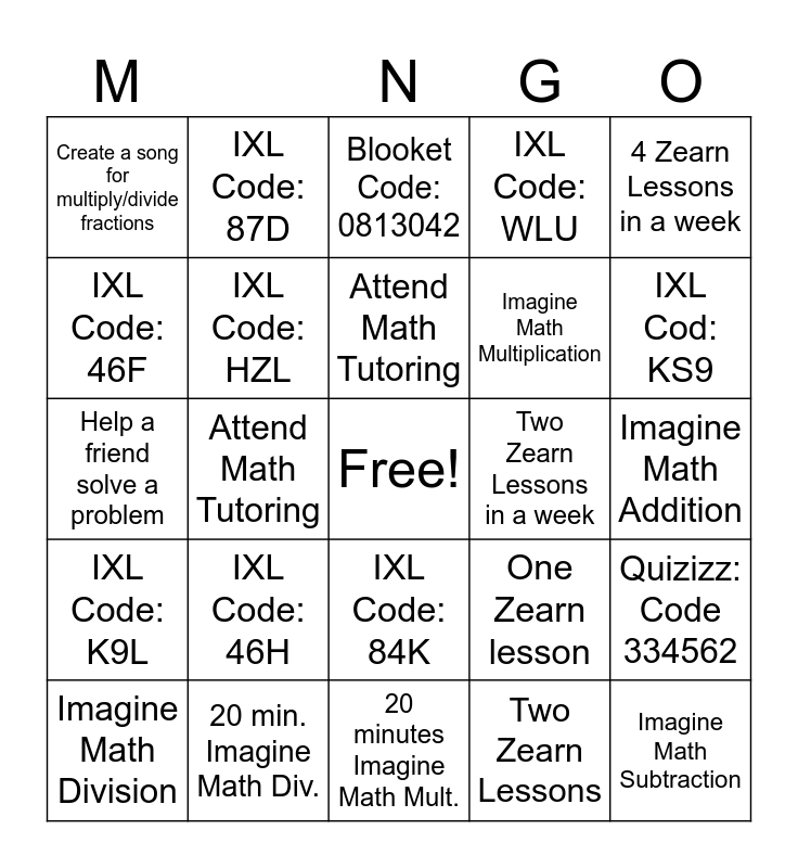 This bingo card has a free space and 24 words: IXL Code: 46H, 20 min. Imagine Math Div., Attend Math Tutoring, Imagine Math Division, 4 Zearn Lessons in a week, Create a song for multiply/divide fractions, IXL Code: 46F, IXL Code: 87D, Two Zearn Lessons in a week, IXL Code: 84K, Imagine Math Multiplication, Help a friend solve a problem, One Zearn lesson, Quizizz: Code 334562, IXL Code: HZL, Two Zearn Lessons, Imagine Math Addition, Blooket Code: 0813042, IXL Cod: KS9, Attend Math Tutoring, Imagine Math Subtraction, IXL Code: K9L, IXL Code: WLU and 20 minutes Imagine Math Mult..