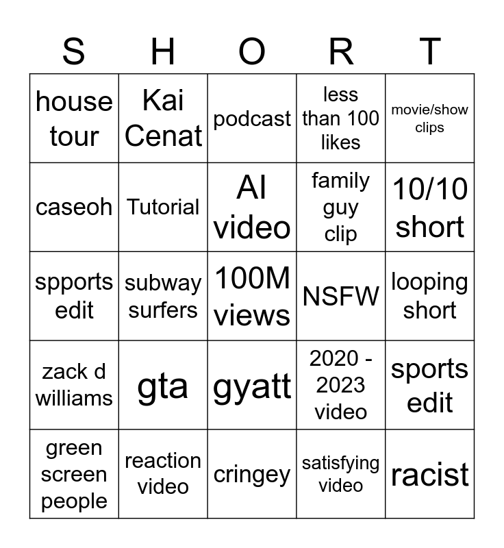 This bingo card has a free space and 24 words: gta, reaction video, AI video, green screen people, movie/show clips, house tour, caseoh, Kai Cenat, NSFW, gyatt, family guy clip, spports edit, 2020 - 2023 video, sports edit, Tutorial, satisfying video, looping short, podcast, 10/10 short, subway surfers, racist, zack d williams, less than 100 likes and cringey.
