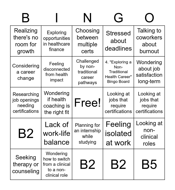 This bingo card has a free space and 615 words: B1, B2, B3, B4, B5, Struggling to decide on a certification, Can’t afford certification fees, Confused by certification updates, Researching different programs, Joining a certification-focused study group, Long waitlists for certification exams, Considering online courses, Stress over continuing education credits, Finding local certification options, Trying to balance work and study, Looking at jobs that require certifications, Choosing between multiple certs, Getting advice from industry professionals, Wondering if certifications are necessary, Planning for an internship while studying, Free webinars but no hands-on experience, Certification requirements vary by state, Delayed exams due to COVID-19, Stressed about deadlines, Finding affordable resources for exam prep, Changing career direction after certification, Too many certification options, Struggling with exam prep, Thinking about certs to specialize, Researching job openings needing certifications, 2. "Burnout in Health Care" Bingo Board, B1, B2, B3, B4, B5, Feeling physically drained, Too much paperwork, Low morale at work, Considering a career change, Overworked and underpaid, Getting frustrated with patient load, Lack of work-life balance, Stressed about hospital staffing, Not enough support from management, No time for personal wellness, Thinking of transitioning to a new role, Looking for ways to prevent burnout, Considering part-time options, Seeking therapy or counseling, Reassessing career goals, Talking to coworkers about burnout, Noticing signs of emotional fatigue, Taking on extra shifts to make ends meet, Difficulty getting time off, Wondering about job satisfaction long-term, Considering a non-clinical role, Feeling isolated at work, Lack of growth opportunities, Overwhelmed by administrative tasks, Researching jobs with less stress, 3. "Stuck in Health Administration" Bingo Board, B1, B2, B3, B4, B5, Missing direct patient care, Frustrated with office politics, Looking for leadership roles, Realizing there's no room for growth, Contemplating switching to another department, Seeking mentorship from other admins, Feeling disconnected from health impact, Wondering if you should go back to school, Lack of meaningful feedback from superiors, Thinking about policy or consulting roles, Considering a career in health technology, Spending too much time on meetings, Finding no motivation to lead, Wanting to impact health system change, Struggling to balance management and patient care, Exploring opportunities in healthcare finance, Realizing you're overqualified for your current role, Looking into project management roles, Reassessing priorities in the healthcare field, Trying to network with other admins, Considering shifting into a non-clinical healthcare role, Dealing with underappreciated staff, Not feeling challenged in current position, Wanting more professional development, Researching a new healthcare role outside administration, 4. "Exploring a Non-Traditional Health Career" Bingo Board, B1, B2, B3, B4, B5, Interested in health informatics, Wondering if health coaching is the right fit, Researching careers in wellness, Thinking about public health data analysis, Looking at non-clinical roles, Unsure if non-traditional health jobs pay well, Wondering if there are certifications for new career paths, Looking into digital health startups, Considering alternative medicine, Wondering how to switch from a clinical to a non-clinical role, Exploring telemedicine career options, Researching health technology fields, Looking for online courses to switch careers, Considering starting a health blog or podcast, Thinking about a job in healthcare education, Challenged by non-traditional career pathways, Networking with people in alternative health careers, Struggling with the idea of career change, Wondering if a career in health tech is feasible, Trying to figure out which field is best for you, Attending conferences to explore non-traditional roles, Looking for a mentor in a non-clinical career, Researching non-traditional health job postings, Considering freelance or consulting work, Nervous about entering a new career space, B1, B2, B3, B4, B5, Struggling to decide on a certification, Can’t afford certification fees, Confused by certification updates, Researching different programs, Joining a certification-focused study group, Long waitlists for certification exams, Considering online courses, Stress over continuing education credits, Finding local certification options, Trying to balance work and study, Looking at jobs that require certifications, Choosing between multiple certs, Getting advice from industry professionals, Wondering if certifications are necessary, Planning for an internship while studying, Free webinars but no hands-on experience, Certification requirements vary by state, Delayed exams due to COVID-19, Stressed about deadlines, Finding affordable resources for exam prep, Changing career direction after certification, Too many certification options, Struggling with exam prep, Thinking about certs to specialize, Researching job openings needing certifications, 2. "Burnout in Health Care" Bingo Board, B1, B2, B3, B4, B5, Feeling physically drained, Too much paperwork, Low morale at work, Considering a career change, Overworked and underpaid, Getting frustrated with patient load, Lack of work-life balance, Stressed about hospital staffing, Not enough support from management, No time for personal wellness, Thinking of transitioning to a new role, Looking for ways to prevent burnout, Considering part-time options, Seeking therapy or counseling, Reassessing career goals, Talking to coworkers about burnout, Noticing signs of emotional fatigue, Taking on extra shifts to make ends meet, Difficulty getting time off, Wondering about job satisfaction long-term, Considering a non-clinical role, Feeling isolated at work, Lack of growth opportunities, Overwhelmed by admini