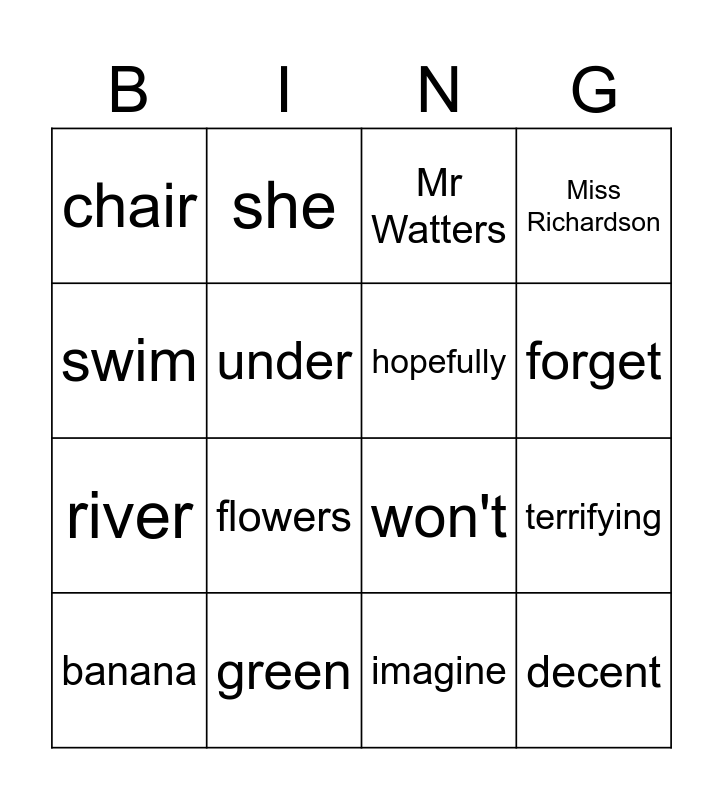 This bingo card has 16 words: green, terrifying, Mr Watters, chair, river, she, won't, imagine, swim, under, banana, Miss Richardson, flowers, forget, hopefully and decent.