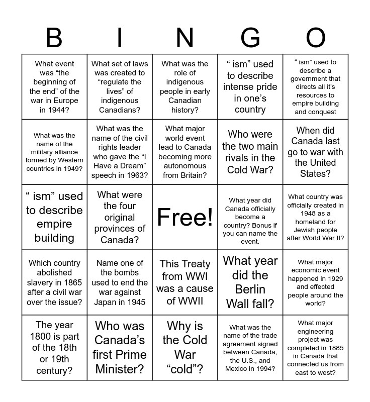 This bingo card has a free space and 24 words: Name one of the bombs used to end the war against Japan in 1945, Who was Canada’s first Prime Minister?, What major world event lead to Canada becoming more autonomous from Britain?, The year 1800 is part of the 18th or 19th century?, “ ism” used to describe a government that directs all it’s resources to empire building and conquest, What event was “the beginning of the end” of the war in Europe in 1944?, What was the name of the military alliance formed by Western countries in 1949?, What set of laws was created to “regulate the lives” of indigenous Canadians?, What year did Canada officially become a country? Bonus if you can name the event., This Treaty from WWI was a cause of WWII, Who were the two main rivals in the Cold War?, “ ism” used to describe empire building, What year did the Berlin Wall fall?, What major economic event happened in 1929 and effected people around the world?, What was the name of the civil rights leader who gave the “I Have a Dream” speech in 1963?, What was the name of the trade agreement signed between Canada, the U.S., and Mexico in 1994?, What country was officially created in 1948 as a homeland for Jewish people after World War II?, What was the role of indigenous people in early Canadian history?, When did Canada last go to war with the United States?, What were the four original provinces of Canada?, What major engineering project was completed in 1885 in Canada that connected us from east to west?, Which country abolished slavery in 1865 after a civil war over the issue?, “ ism” used to describe intense pride in one’s country and Why is the Cold War “cold”?.