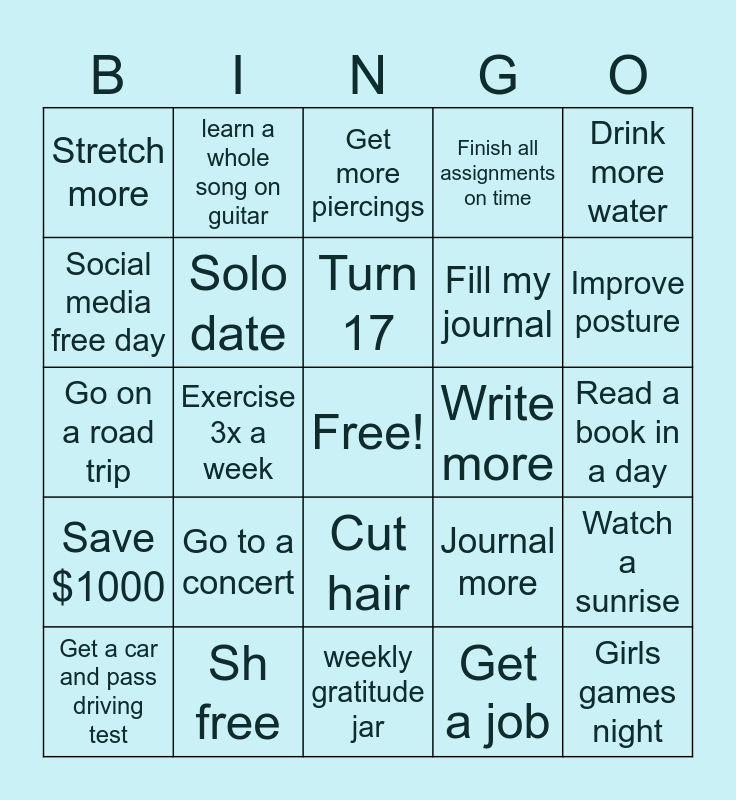 This bingo card has a free space and 24 words: Get a car and pass driving test, Go to a concert, Turn 17, Get a job, Drink more water, Stretch more, learn a whole song on guitar, Get more piercings, Write more, Read a book in a day, Go on a road trip, Solo date, Journal more, Watch a sunrise, Social media free day, Sh free, weekly gratitude jar, Finish all assignments on time, Improve posture, Save $1000, Exercise 3x a week, Cut hair, Fill my journal and Girls games night.