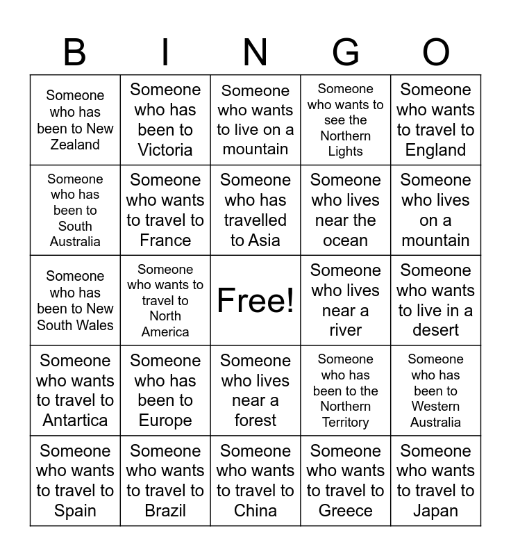 This bingo card has a free space and 25 words: Someone who has been to Europe, Someone who wants to travel to China, Someone who has travelled to Asia, Someone who wants to travel to Spain, Someone who wants to travel to England, Someone who has been to New Zealand, Someone who has been to South Australia, Someone who has been to Victoria, Someone who lives near a river, Someone who lives near a forest, Someone who lives near the ocean, Someone who has been to New South Wales, Someone who has been to the Northern Territory, Someone who has been to Western Australia, Someone who wants to travel to France, Someone who wants to live near the beach, Someone who wants to live in a desert, Someone who wants to live on a mountain, Someone who lives on a mountain, Someone who wants to travel to North America, Someone who wants to travel to Japan, Someone who wants to travel to Brazil, Someone who wants to travel to Antartica, Someone who wants to see the Northern Lights and Someone who wants to travel to Greece.