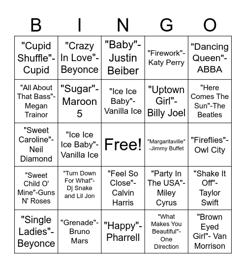 This bingo card has a free space and 24 words: "Single Ladies"-Beyonce, "Turn Down For What"-Dj Snake and Lil Jon, "Ice Ice Baby"- Vanilla Ice, "What Makes You Beautiful"- One Direction, "Dancing Queen"- ABBA, "Cupid Shuffle"-Cupid, "Crazy In Love"- Beyonce, "Baby"- Justin Beiber, "Margaritaville" -Jimmy Buffet, "Fireflies"- Owl City, "Sweet Caroline"-Neil Diamond, "Sugar"-Maroon 5, "Party In The USA"- Miley Cyrus, "Shake It Off"- Taylor Swift, "All About That Bass"- Megan Trainor, "Grenade"-Bruno Mars, "Happy"-Pharrell, "Firework"-Katy Perry, "Here Comes The Sun"-The Beatles, "Sweet Child O' Mine"-Guns N' Roses, "Ice Ice Ice Baby"- Vanilla Ice, "Feel So Close"-Calvin Harris, "Uptown Girl"- Billy Joel and "Brown Eyed Girl"- Van Morrison.